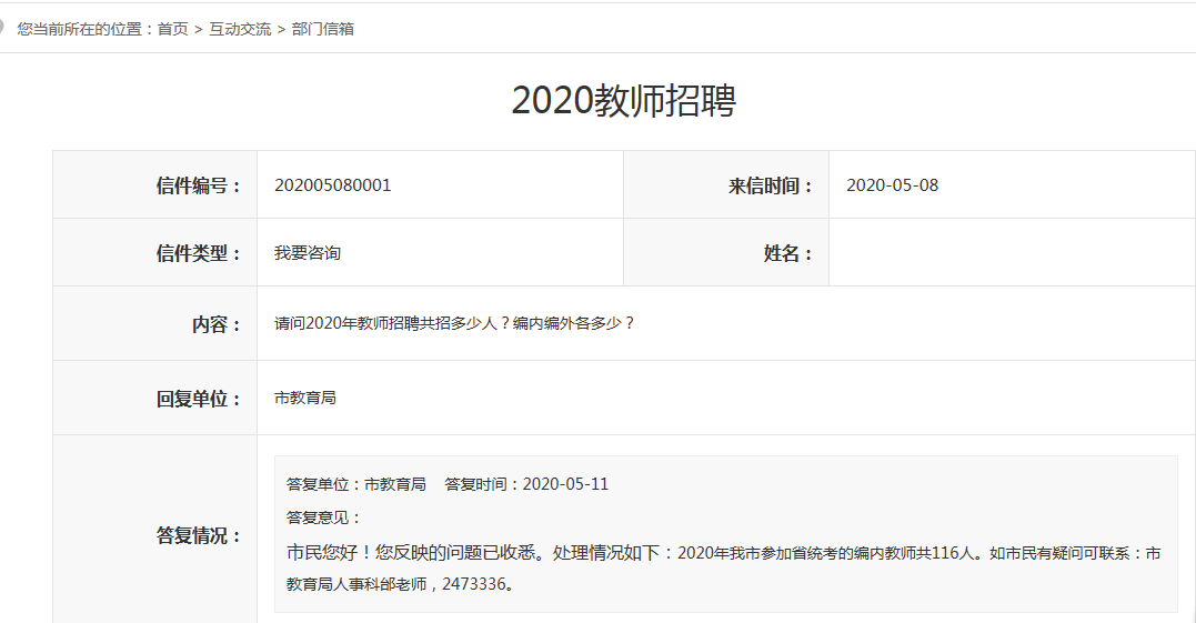 | 市民您好!您反映的問題已收悉。處理情況如下:2020年我市參加省統(tǒng)考的編內(nèi)教師共116人。如市民有疑問可聯(lián)系:市教育局人事科邰老師,2473336。 | |||