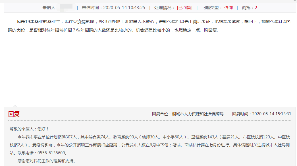 5月14日考生向桐城人社局提問事業(yè)單位招聘情況,以下是詳細(xì)內(nèi)容: