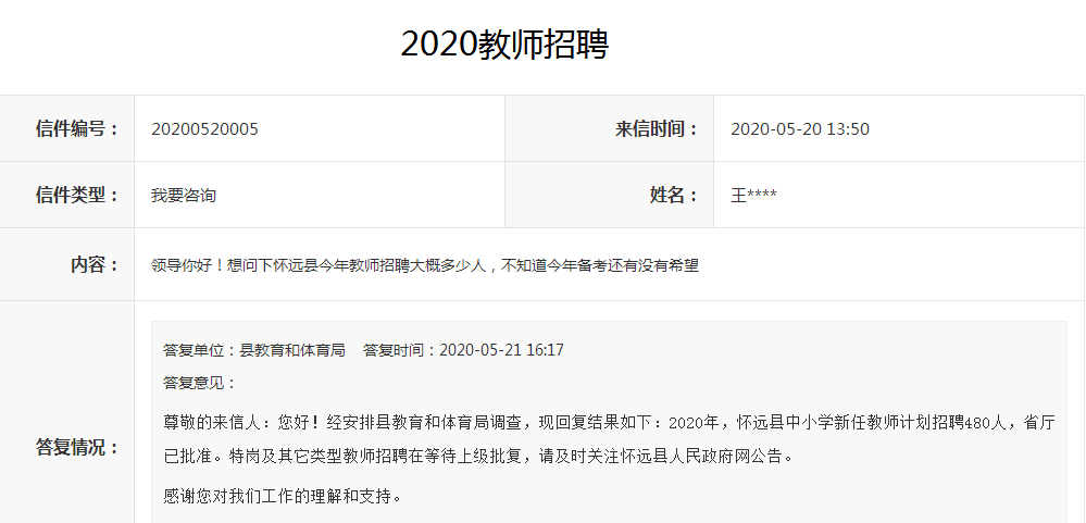 尊敬的來信人:您好!經(jīng)安排縣教育和體育局調(diào)查,現(xiàn)回復(fù)結(jié)果如下:2020年,懷遠(yuǎn)縣中小學(xué)新任教師計劃招聘480人,省廳已批準(zhǔn)。特崗及其它類型教師招聘在等待上級批復(fù),請及時關(guān)注懷遠(yuǎn)縣人民政府網(wǎng)公告。