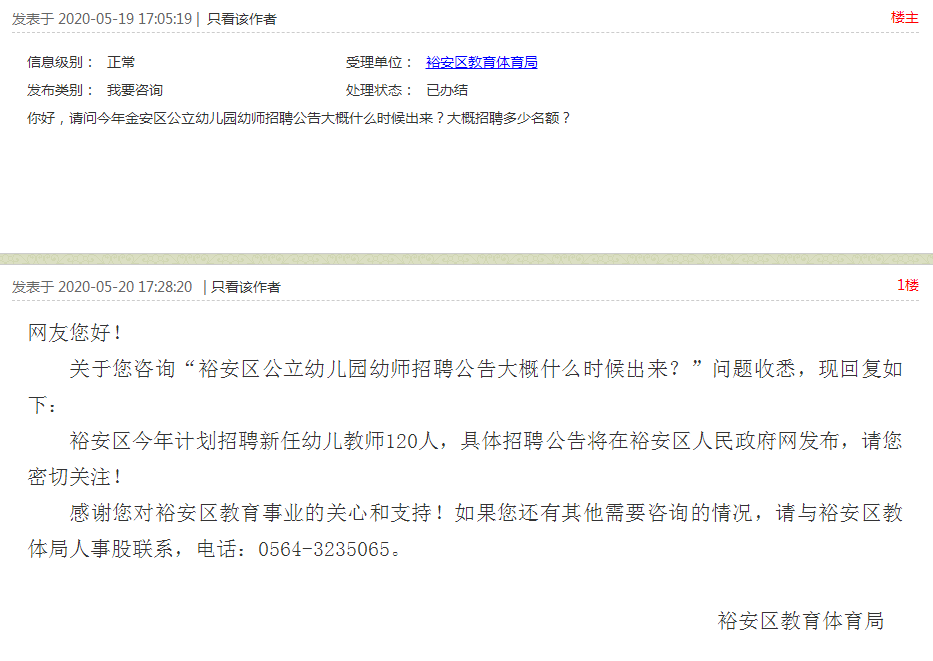 關(guān)于您咨詢“裕安區(qū)公立幼兒園幼師招聘公告大概什么時(shí)候出來?”問題收悉,現(xiàn)回復(fù)如下: