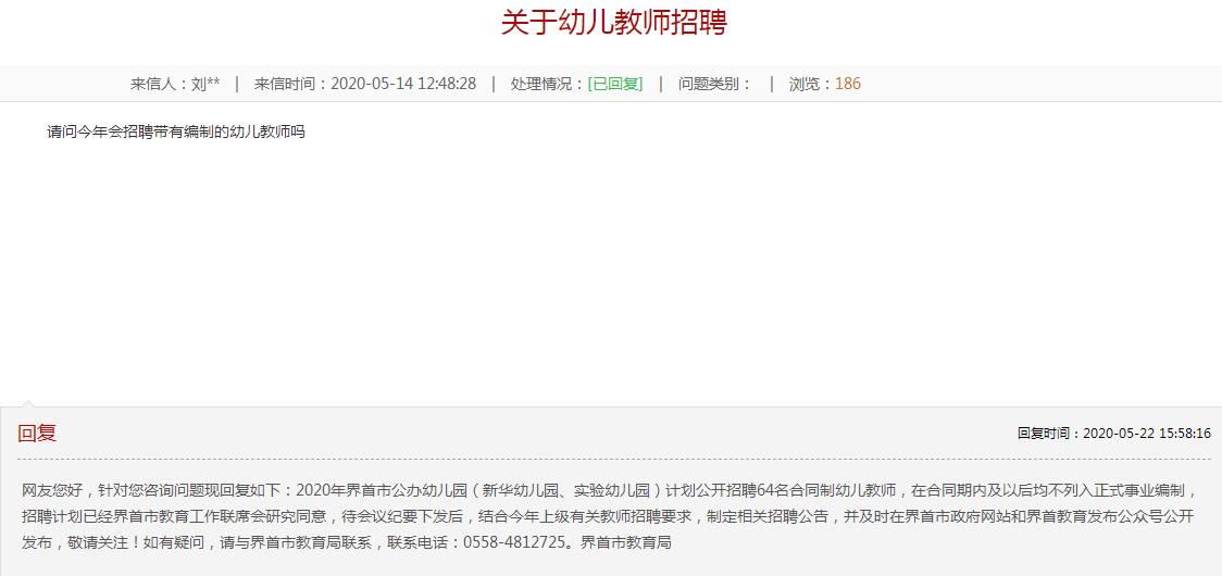 網(wǎng)友您好,針對您咨詢問題現(xiàn)回復(fù)如下:2020年界首市公辦幼兒園(新華幼兒園、實(shí)驗(yàn)幼兒園)計(jì)劃公開招聘64名合同制幼兒教師,在合同期內(nèi)及以后均不列入正式事業(yè)編制,招聘計(jì)劃已經(jīng)界首市教育工作聯(lián)席會(huì)研究同意,待會(huì)議紀(jì)要下發(fā)后,結(jié)合今年上級(jí)有關(guān)教師招聘要求,制定相關(guān)招聘公告,并及時(shí)在界首市政府網(wǎng)站和界首教育發(fā)布公眾號(hào)公開發(fā)布,敬請關(guān)注!如有疑問,請與界首市教育局聯(lián)系,聯(lián)系電話:0558-4812725。界首市教育局