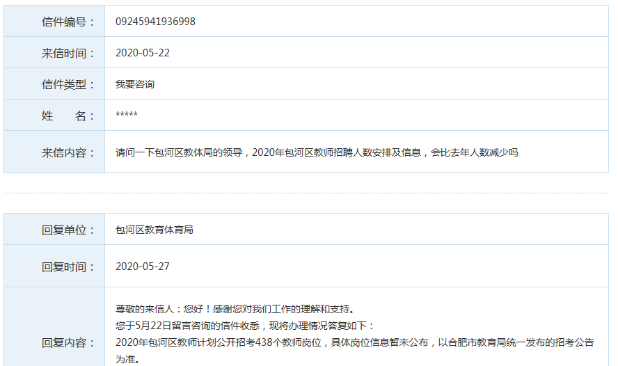 回復(fù)內(nèi)容:尊敬的來(lái)信人:您好!感謝您對(duì)我們工作的理解和支持。您于5月22日留言咨詢(xún)的信件收悉,現(xiàn)將辦理情況答復(fù)如下:2020年包河區(qū)教師計(jì)劃公開(kāi)招考438個(gè)教師崗位,具體崗位信息暫未公布,以合肥市教育局統(tǒng)一發(fā)布的招考公告為準(zhǔn)。
