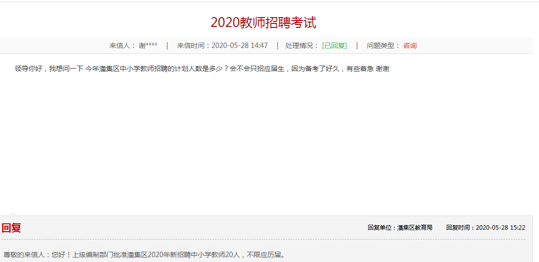 尊敬的來(lái)信人:您好!上級(jí)編制部門(mén)批準(zhǔn)潘集區(qū)2020年新招聘中小學(xué)教師20人,不限應(yīng)歷屆。