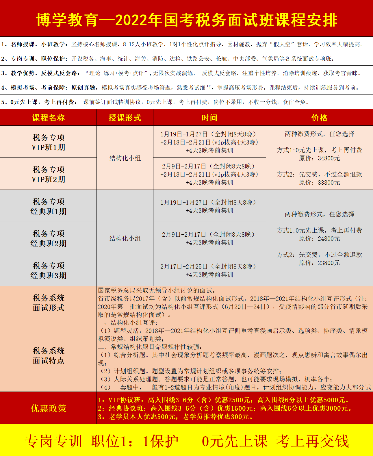 稅務(wù)局面試形式和特點 面試形式:國家稅務(wù)總局采取無領(lǐng)導(dǎo)小組討論的面試。 省市級稅務(wù)局2017年(含)以前常規(guī)結(jié)構(gòu)化面試形式,2018年—2021年結(jié)構(gòu)化小組互評形式(注:2020年第一批面試均為結(jié)構(gòu)化小組互評形式(6月20日—24日),受疫情影響的部分省市延期后采取的是常規(guī)結(jié)構(gòu)化面試)。 面試題量:結(jié)構(gòu)化小組互評每套題3道題目;常規(guī)結(jié)構(gòu)化面試每套題4道題目。 面試時間: (1)結(jié)構(gòu)化小組互評:15分鐘場外備考看題,進(jìn)入考場后,按要求每人依次答題,每道題目3分鐘(注:個人答題時間:2020年—2021年均為3分鐘,2018年—2019年均為2分鐘);全部答題結(jié)束,按要求展開互評,點評每人的時間為2分鐘;被點評人針對點評展開回應(yīng),時間2分鐘。 (2)常規(guī)結(jié)構(gòu)化面試:4道題目20分鐘,剩余3分鐘提醒時間。 (3)無領(lǐng)導(dǎo)討論:20分鐘場外備考看材料,然后進(jìn)入考場總時間85分鐘,首先個人陳述每人3分鐘,然后根據(jù)問題展開自由討論,最后推選一個代表作5分鐘陳述總結(jié)。 考查方式:看題+聽題相結(jié)合的 面試試題特點 第一、結(jié)構(gòu)化小組互評: (1)題型靈活,2018年—2021年結(jié)構(gòu)化小組互評側(cè)重考查漫畫啟示類、選項類、排序類、情景模擬演說類、組織策劃類; 第二、常規(guī)結(jié)構(gòu)化題目命題規(guī)律性較強: (1)綜合分析題。其中社會現(xiàn)象分析題考察頻率最高,漫畫題次之,觀點思辨和寓言故事偶爾出現(xiàn); (2)計劃組織題。題型設(shè)置為常規(guī)計劃組織或多項事務(wù)統(tǒng)籌安排; (3)人際關(guān)系處理題。答題要求可能是正常答題,也可能要求現(xiàn)場模擬,機率各半; (4)一套題中,一般有1-2道題目為專業(yè)情境(角度)題目,計劃組織協(xié)調(diào)能力、應(yīng)變能力大部分試題為國稅專業(yè)情境題,綜合分析有少量的國稅專業(yè)角度題目,總體難度不大。